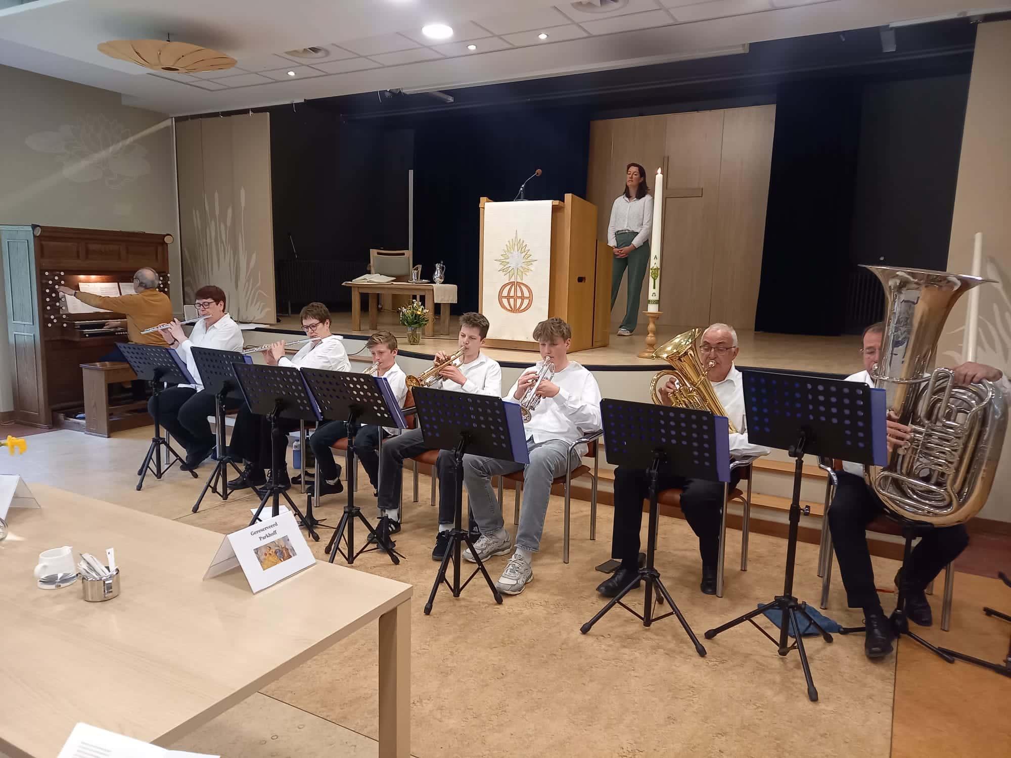 De foto’s lijken elke jaar sterk op elkaar maar dit jaar toch 2 nieuwe dingen die opvallen. Allereerst de aanwezigheid van Jefta. Terwijl de rest van de blazers de nummers wel kunnen dromen (elk jaar min of meer hetzelfde repertoire) moest Jefta in 4 weken tijd 7 Paasnummers instuderen. En dat ging hem goed af. Complimenten hiervoor. Wat ook opvalt is dat de sousafoon ingeruild is voor de bas-bariton. Al met al werd onze bijdrage weer zeer gewaardeerd.